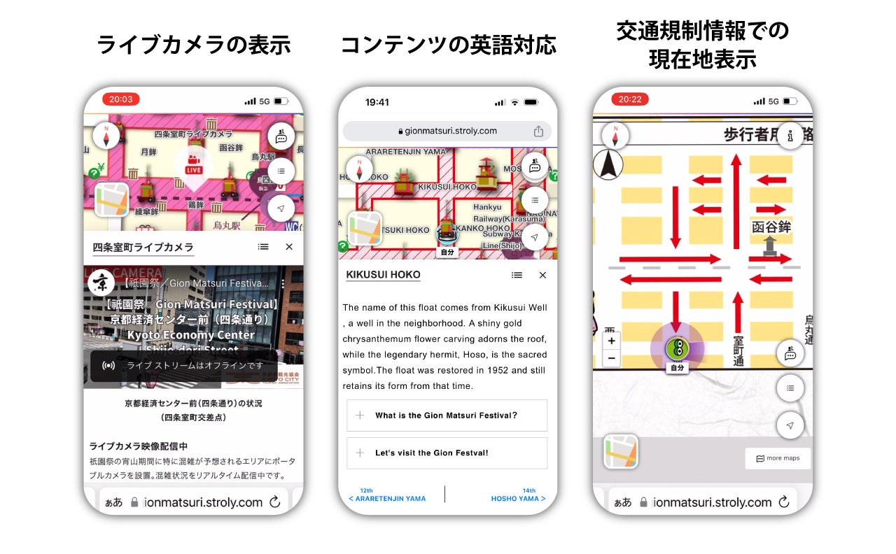 「令和4年から、コロナ禍での非接触の案内誘導による混雑回避を図るため、 ストローリーのデジタルマップを導入しました。 スマホのGPSとの連動機能や充実したコンテンツにより、多くの観覧客の 方に御利用いただいています。京都府警察とも連携し、現場警察官の案内ツール として活用することで、今年も大きな事故やトラブルもなく終えることができ、祇園祭宵山の安全・安心な観覧環境確保のため、とても役立っています。」
