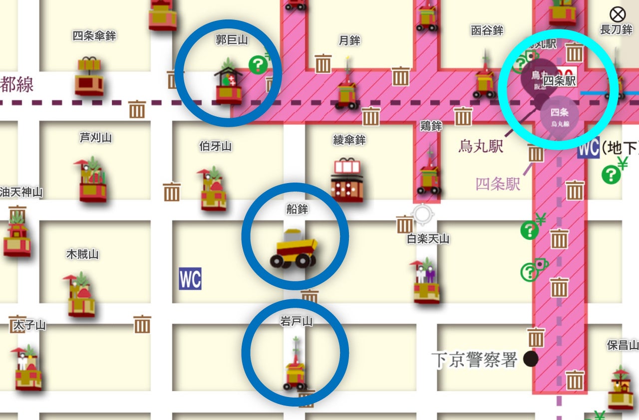 ・スマホで見れるデジタル仕様だし、トイレやゴミ箱の位置が記されているので便利です。よく見ると山鉾が特徴を捉えたイラストに!芸が細かすぎる!