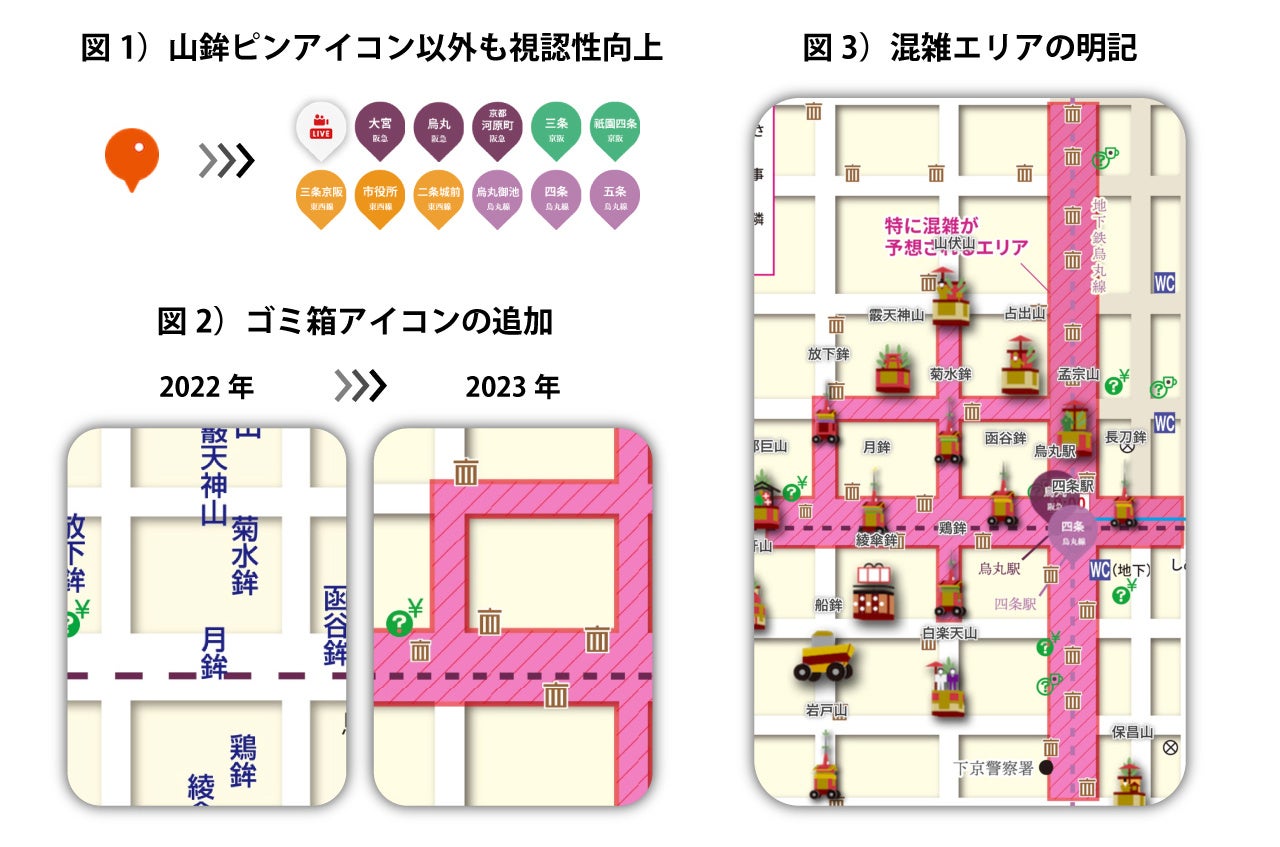 祇園祭は住居や店舗が密集するエリアで開催されることから、毎年期間中のポイ捨てが地域の中で課題になっていました。2023年度版では、ゴミステーションの位置を「ゴミ箱」アイコンで表記。