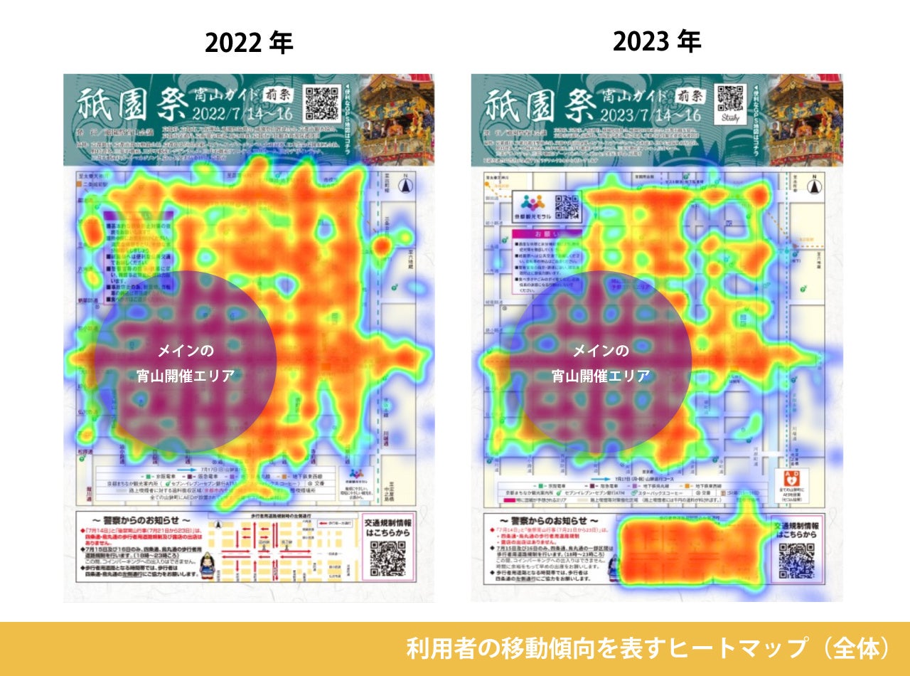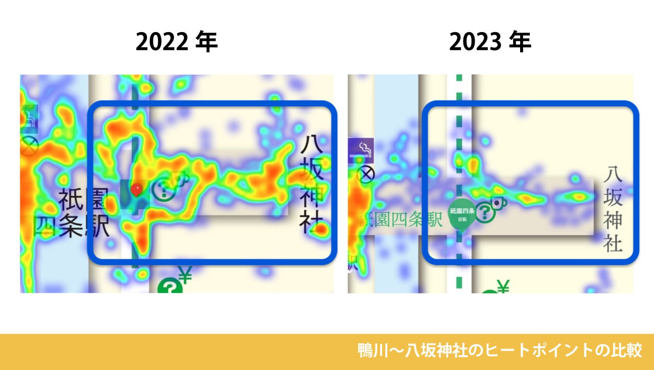 また、八坂神社周辺では昨年に比べるとヒートポイントが減少傾向にあることから、上記と同様に山鉾との位置関係を直感的に把握できたことによって、利用者の目的地(山鉾周辺または八坂神社)に合わせた移動を促せたのではないかと推察できます。